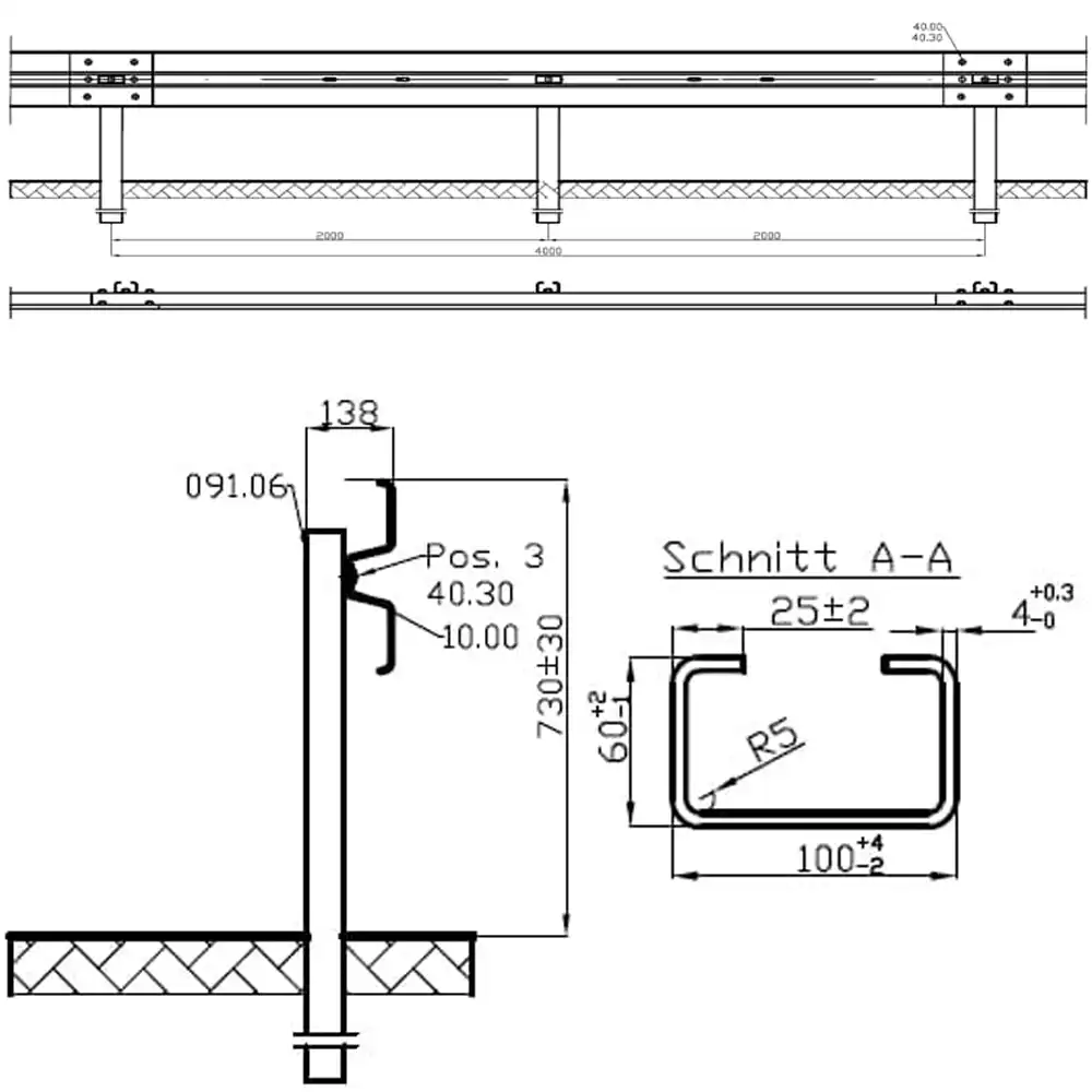 Bariera N2W3A wykonana jest z wysokogatunkowej stali S355JR lub S235JR, co gwarantuje jej trwałość i odporność na korozję. Elementy bariery są cynkowane zgodnie z normą EN ISO 1461, co dodatkowo zabezpiecza je przed działaniem warunków atmosferycznych. Prowadnica typu B o długości 4300 mm, w połączeniu ze słupkami C-100 o wysokości 1700 mm, tworzy solidną konstrukcję. System mocowany jest za pomocą śrub i nakrętek zgodnych z normami ISO, co zapewnia stabilność i łatwość montażu.