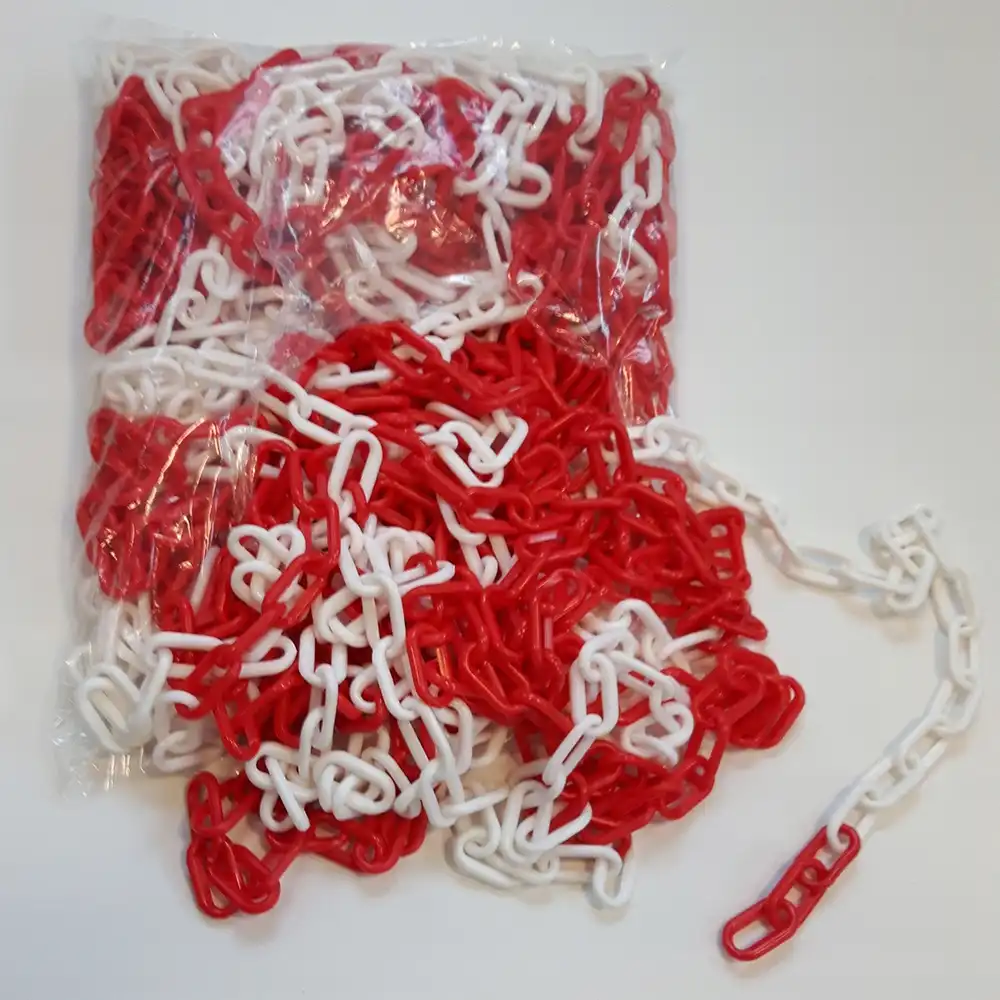 Czerwono-biały plastikowy łańcuch to niezawodne narzędzie, które doskonale sprawdza się jako element mocujący do słupków plastikowych lub innych elementów łączących. Jego solidna konstrukcja gwarantuje trwałe i wytrzymałe zabezpieczenie obszarów podczas prac drogowych, kanalizacyjnych czy wykopów. Idealny do tymczasowego wygrodzenia parkingów, hal garażowych czy miejsc parkingowych w parkingu podziemnym.