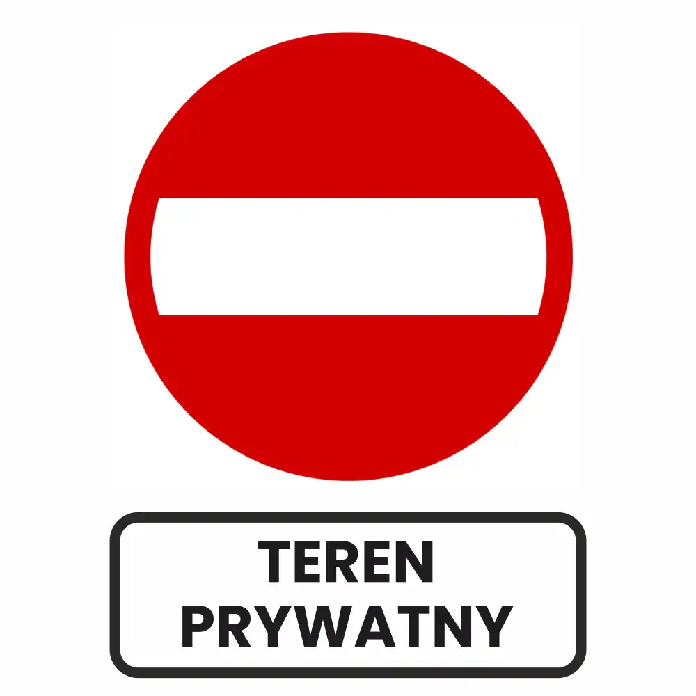 W skład zestawu wchodzą znak drogowy B-2 oraz tabliczka tekstowa z napisem „Teren Prywatny”. Znak B-2 „zakaz ruchu w obu kierunkach” służy do skutecznego zamknięcia wybranego odcinka drogi lub posesji dla ruchu pojazdów. Dzięki temu rozwiązaniu możliwe jest zabezpieczenie prywatnej przestrzeni przed nieuprawnionym wjazdem, co zwiększa bezpieczeństwo i porządek na posesji.