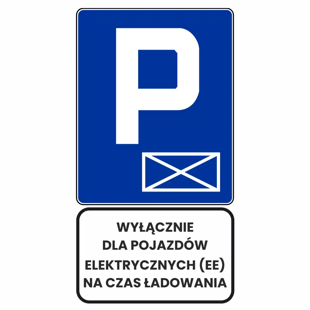 Zestaw składa się z znaku D-18a "parking – miejsce zastrzeżone" o wymiarach 600x750 mm oraz tabliczki z tekstem (600x360 mm), która precyzyjnie informuje o przeznaczeniu miejsca dla pojazdów elektrycznych w trakcie ładowania. Znak D-18a oznacza miejsce parkingowe zarezerwowane dla uprawnionych użytkowników, a dołączona tabliczka dodatkowo wskazuje na jego funkcję – ładowanie pojazdów elektrycznych (EE).