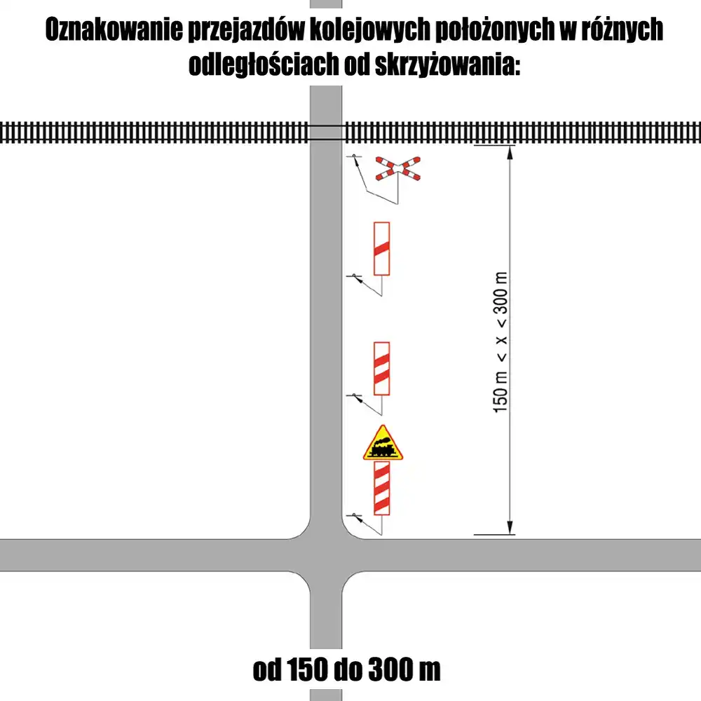 Znak A-10 jest montowany w ściśle określonych odległościach od przejazdu: