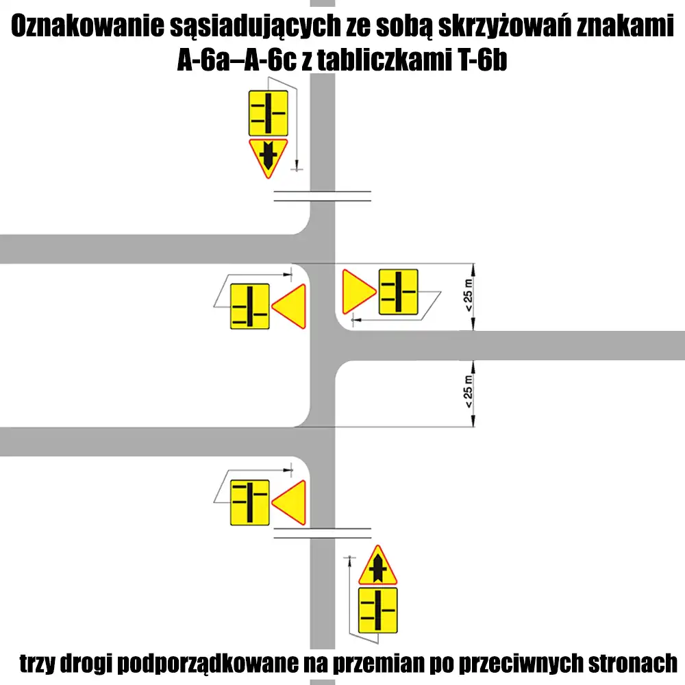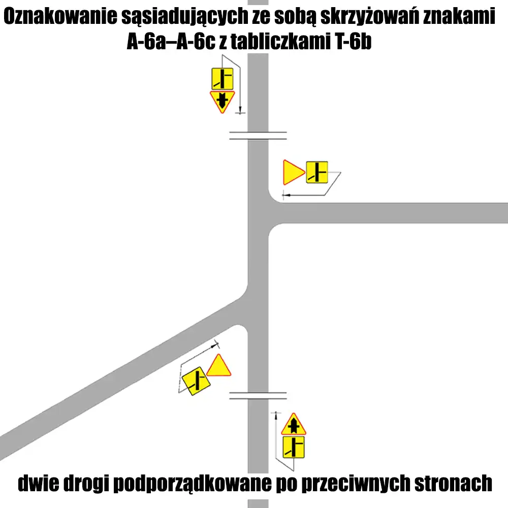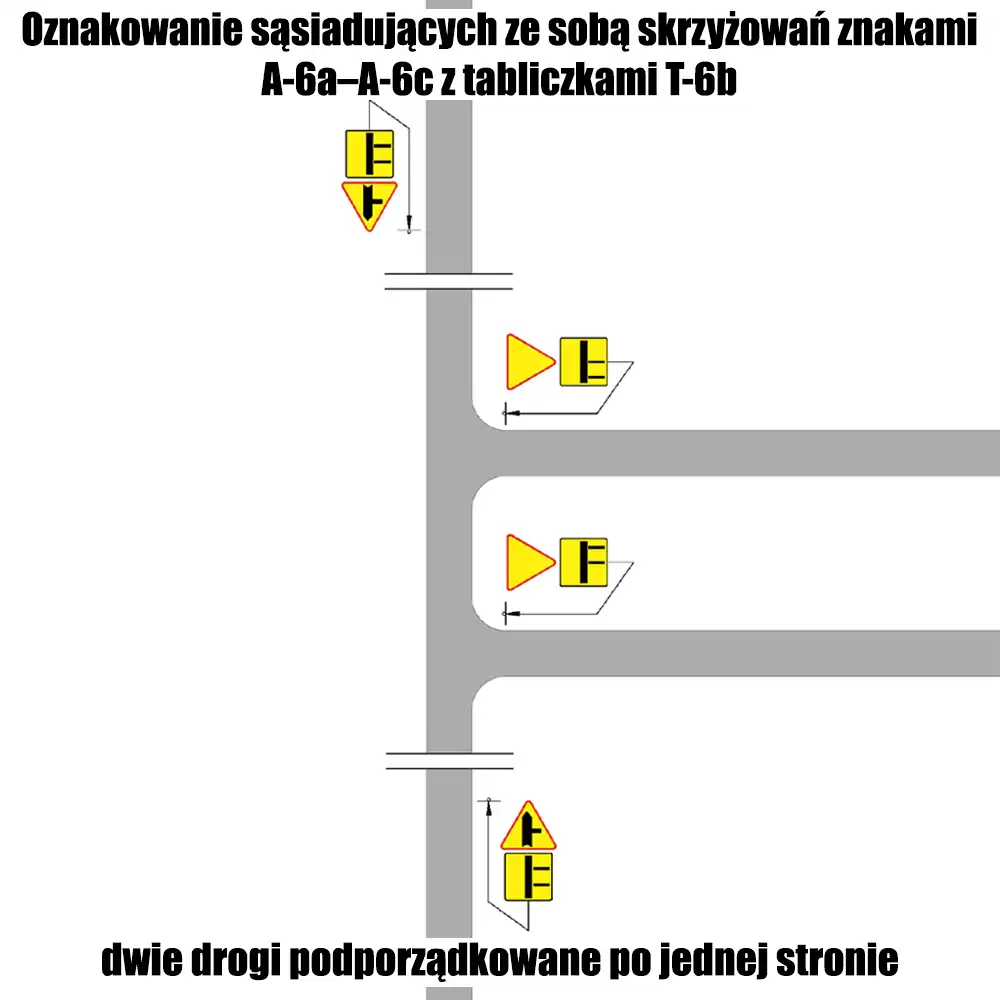 Na skrzyżowaniach o nietypowym układzie dróg można dodatkowo stosować tabliczkę T-6b, która przedstawia schematyczny układ dróg. Jest to przydatne w sytuacjach, gdy wloty drogi podporządkowanej występują tylko po jednej stronie drogi głównej lub gdy droga główna przebiega w łuku. Tabliczka ta ułatwia kierowcom zrozumienie specyficznych warunków drogowych.