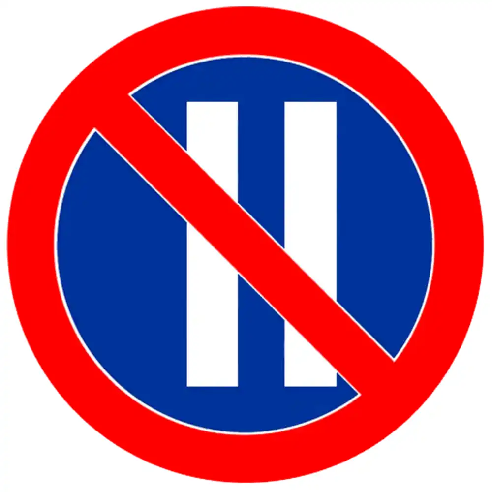 okrągły znak z czerwonym obramowaniem i niebieskim tłem, na środku znajdują się dwie pionowe białe kreski, przekreślone czerwoną linią | znak ten zakazuje postoju pojazdu, czyli unieruchomienia pojazdu dłuższego niż 1 minuta, w dni parzyste |