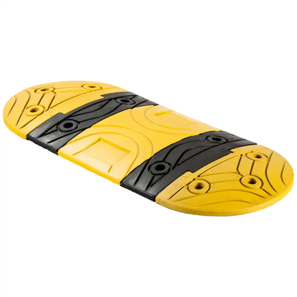 Konstrukcja progu wyróżnia się naprzemiennym zastosowaniem barwy żółtej i czarnej, co zwiększa jego widoczność w każdych warunkach oświetleniowych. Taki kontrast sprawia, że próg jest łatwo zauważalny zarówno w ciągu dnia, jak i w nocy, co przyczynia się do podniesienia bezpieczeństwa na drodze. Zakończenia progu dostępne są w dwóch wariantach kolorystycznych: żółtym i czarnym, co pozwala na dostosowanie wyglądu do indywidualnych potrzeb i preferencji.