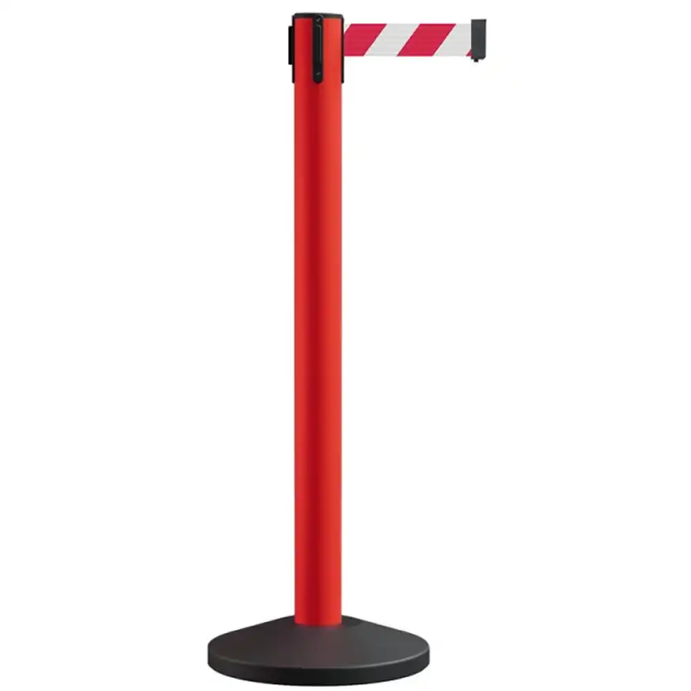 Mechanizm wyposażony jest w system hamowania, który zapobiega uderzeniom oraz splątaniu taśmy przy zwijaniu. To z kolei zwiększa nie tylko bezpieczeństwo, ale również trwałość urządzenia oraz jego funkcjonalność. Taśma ostrzegawcza biało-czerwona doskonale widoczna, co jeszcze bardziej podnosi poziom bezpieczeństwa.