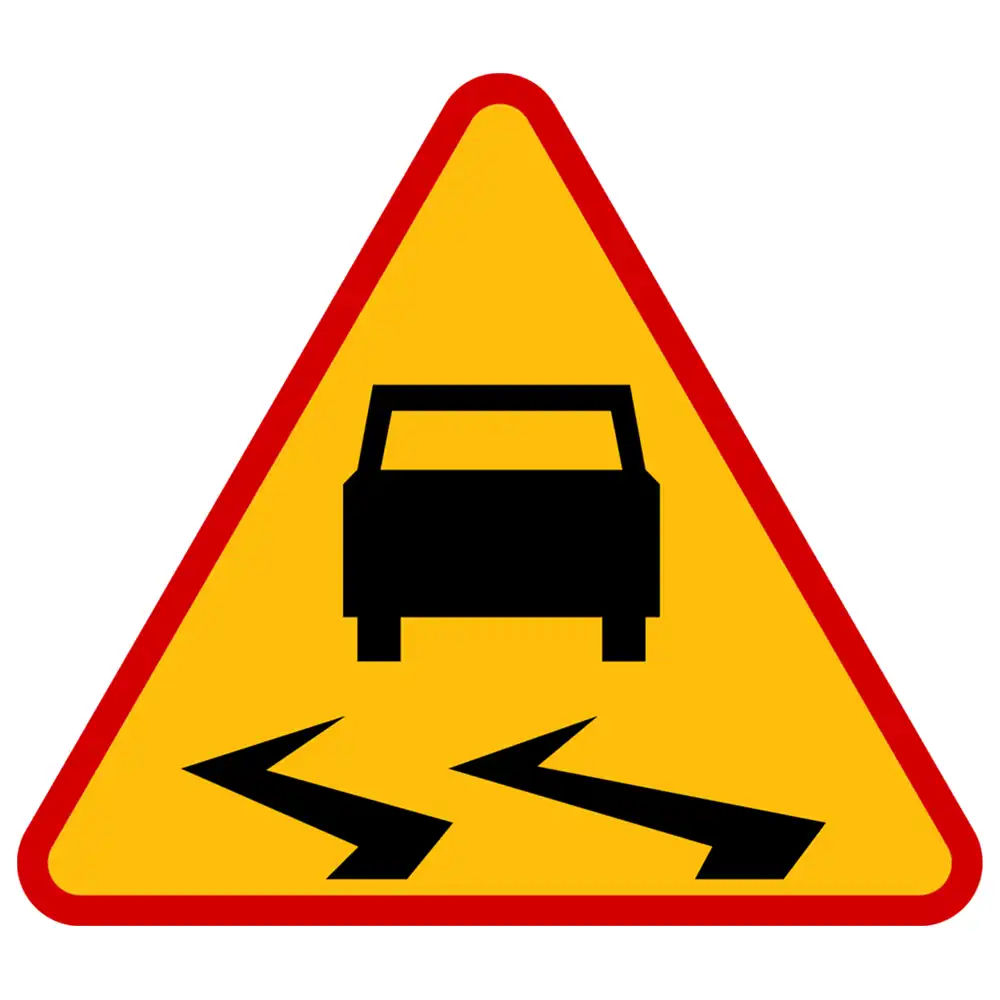 Znak drogowy A-15 "śliska jezdnia" ostrzega o możliwości poślizgu pojazdu spowodowanego w szczególności zmianą nawierzchni jezdni, stałym lub okresowym jej zawilgoceniem.