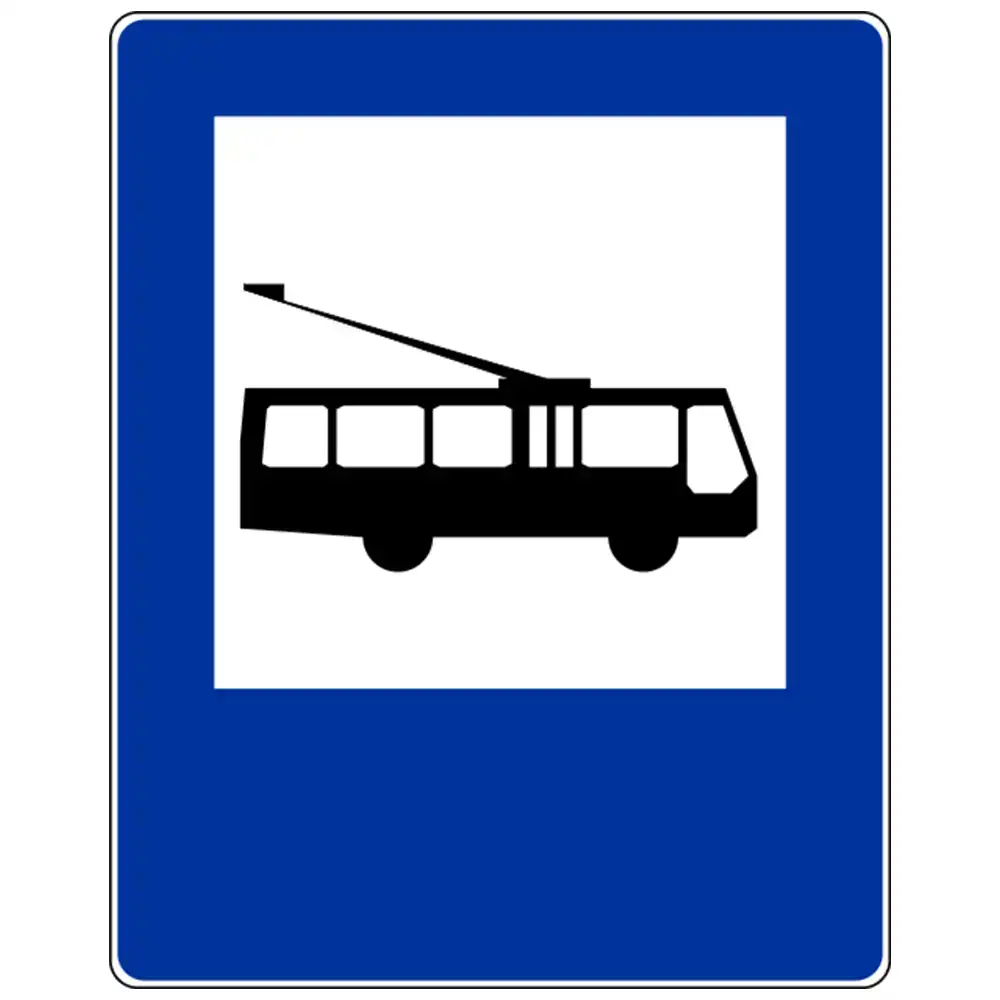 Informuje o miejscu na jezdni przeznaczonym do zatrzymywania się trolejbusów komunikacji publicznej.