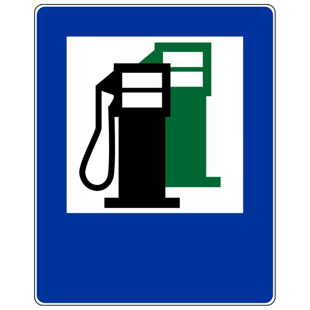 Informuje, że w odległości wskazanej na znaku znajduje się stacja zaopatrywania w paliwo. Znak może być umieszczony w innym miejscu niż po prawej stronie jezdni.